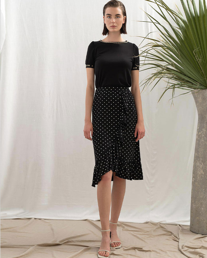 Η φούστα φάκελος παραμένει στη λίστα με τα πιο δημοφιλή κομμάτια και για αυτήν την σεζόν. Ακόμη περισσότερο όταν πρόκειται σε πουά printπου κάνει την εμφάνισή μας να μην περνάει σίγουρα απαρατήρητη. Μας συνοδεύει στα look του γραφείου μας αλλά και με t-shirt για βόλτα το απόγευμα.