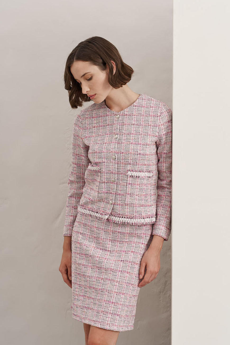 Ροζ Ζακέτα και Φούστα από ελαστικό tweed με lurex λεπτομέρειες