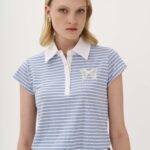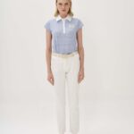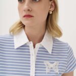 Ρομαντική ριγέ μπλούζα από πλεκτό ύφασμα μίξης βισκόζης με δαντέλα στον γιακά