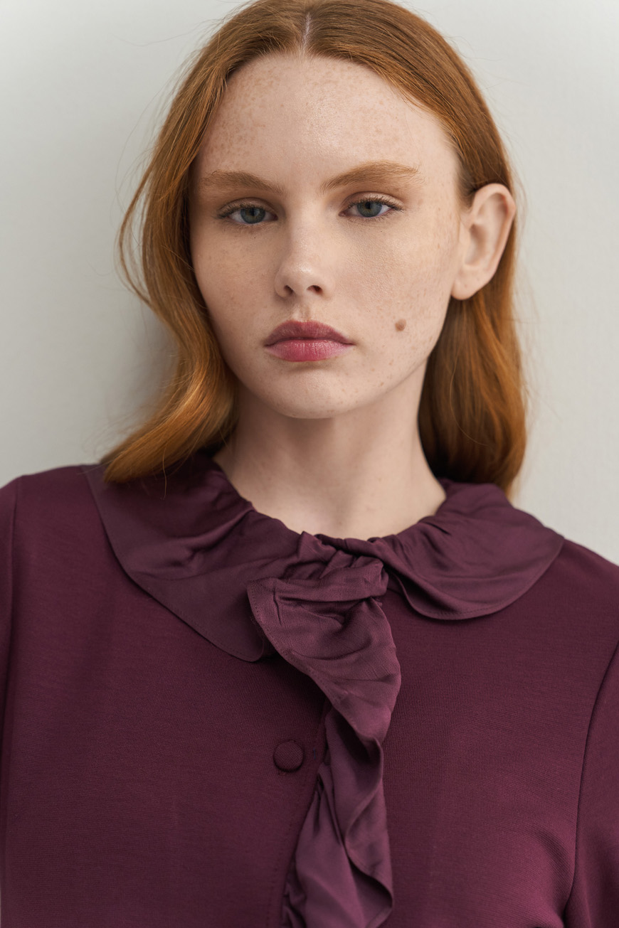 Λεπτομέρεια με σατέν βολάν στη λαιμουδιά και εμπρός